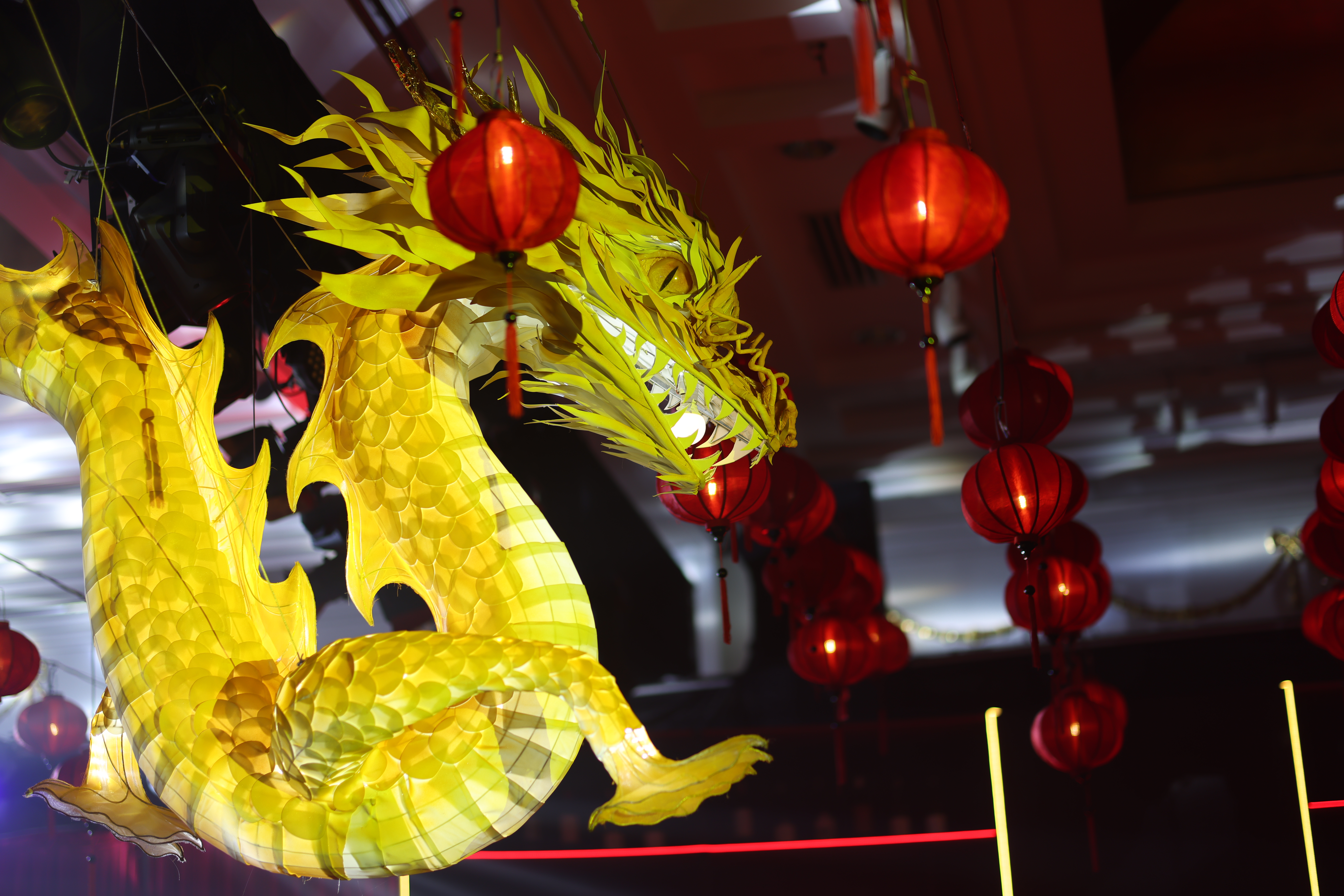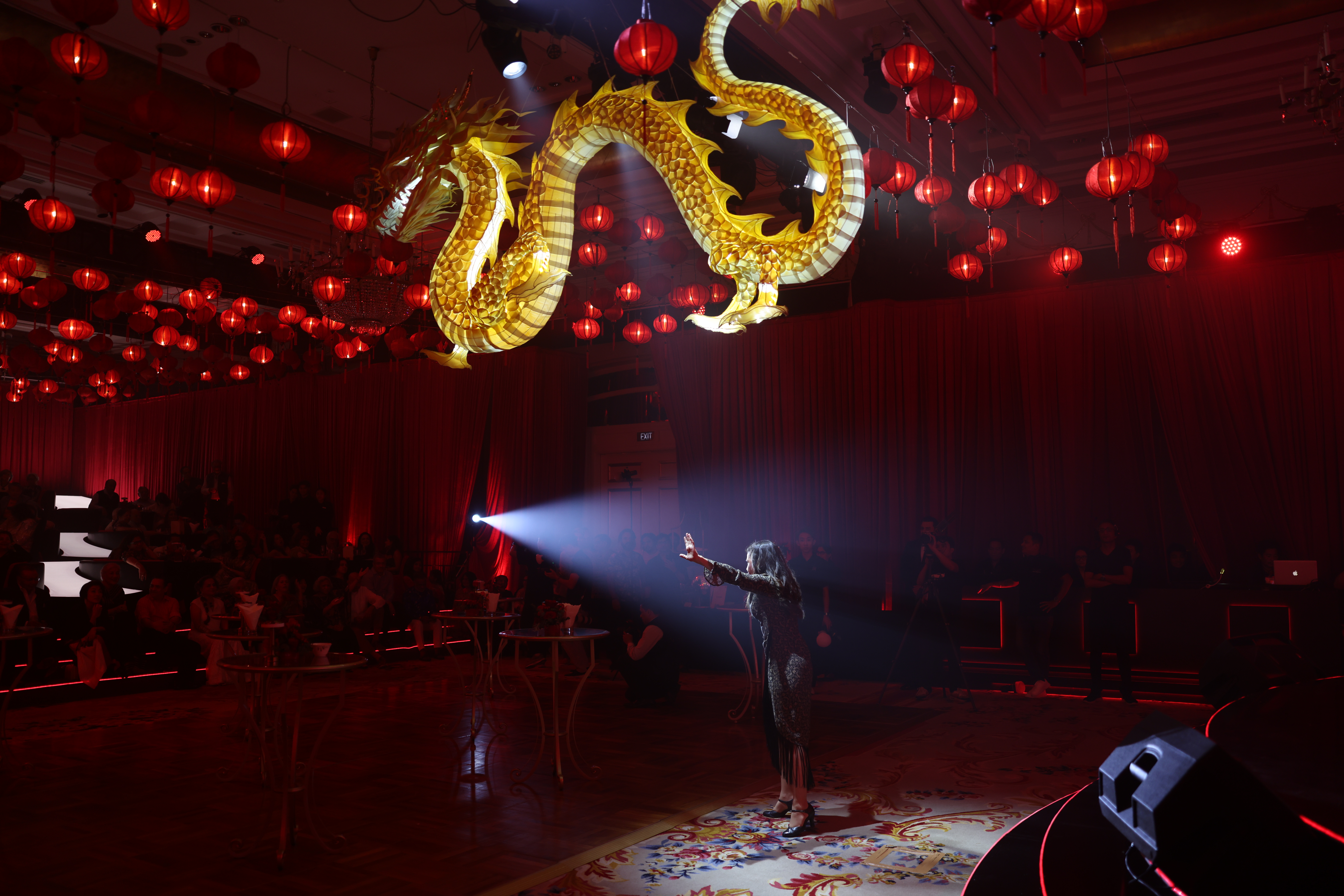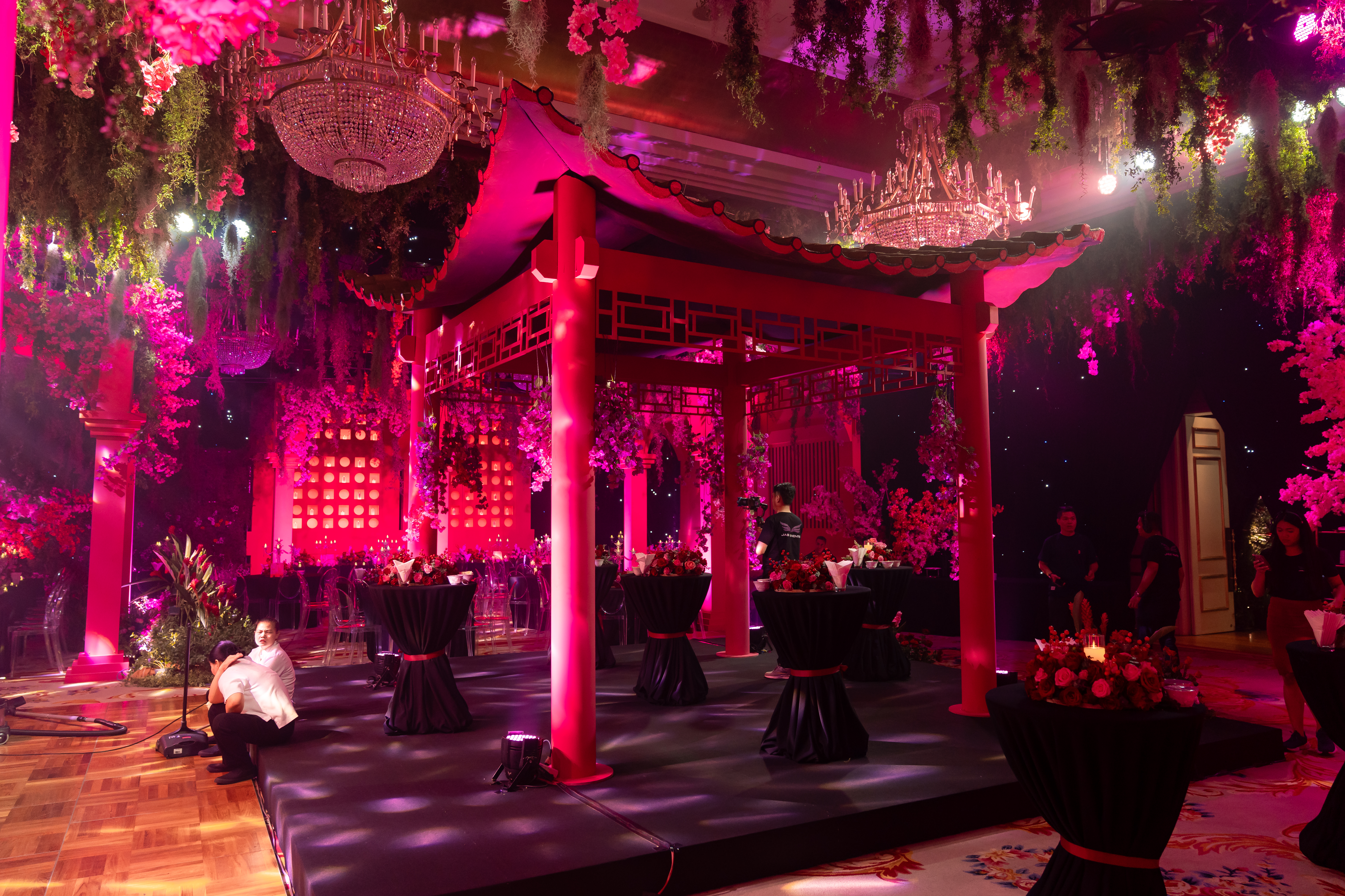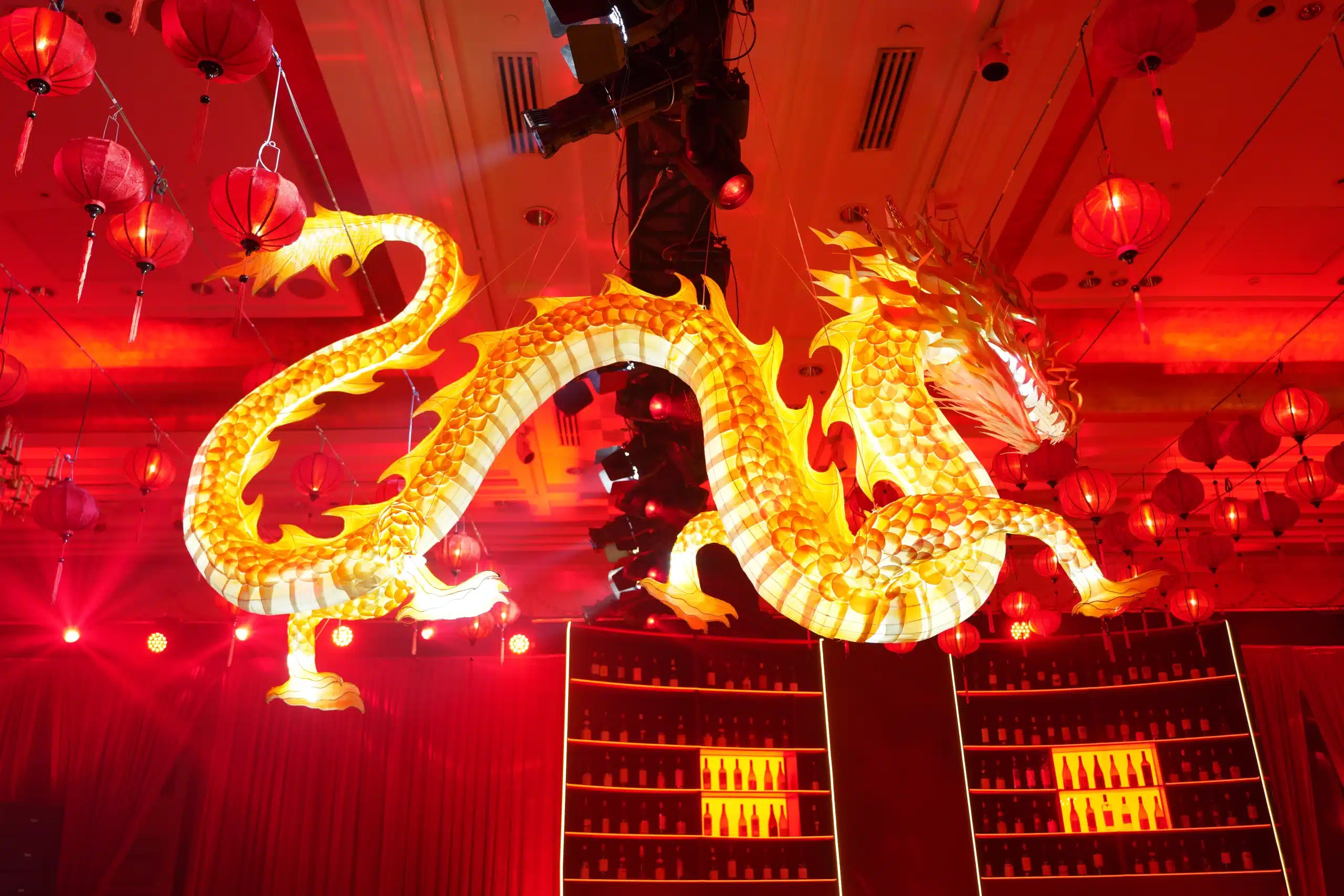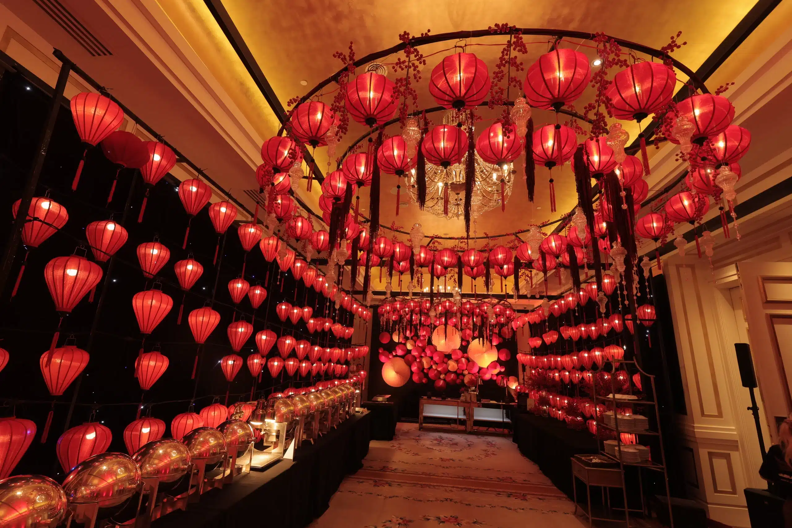 Above them, more than 5,000 hand-selected red Chinese lanterns filled the ceiling, each individually suspended to form a glowing sky of crimson light.