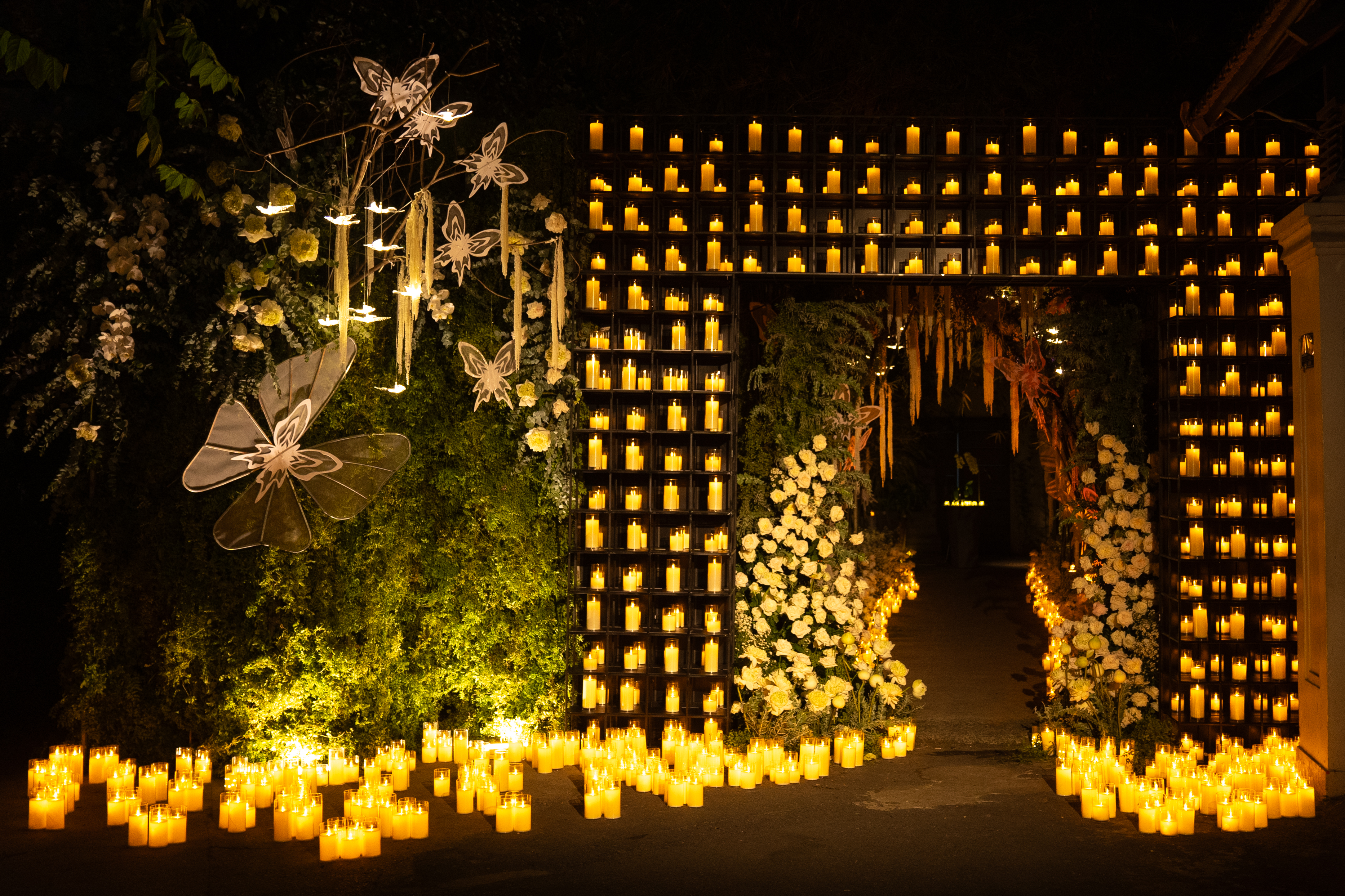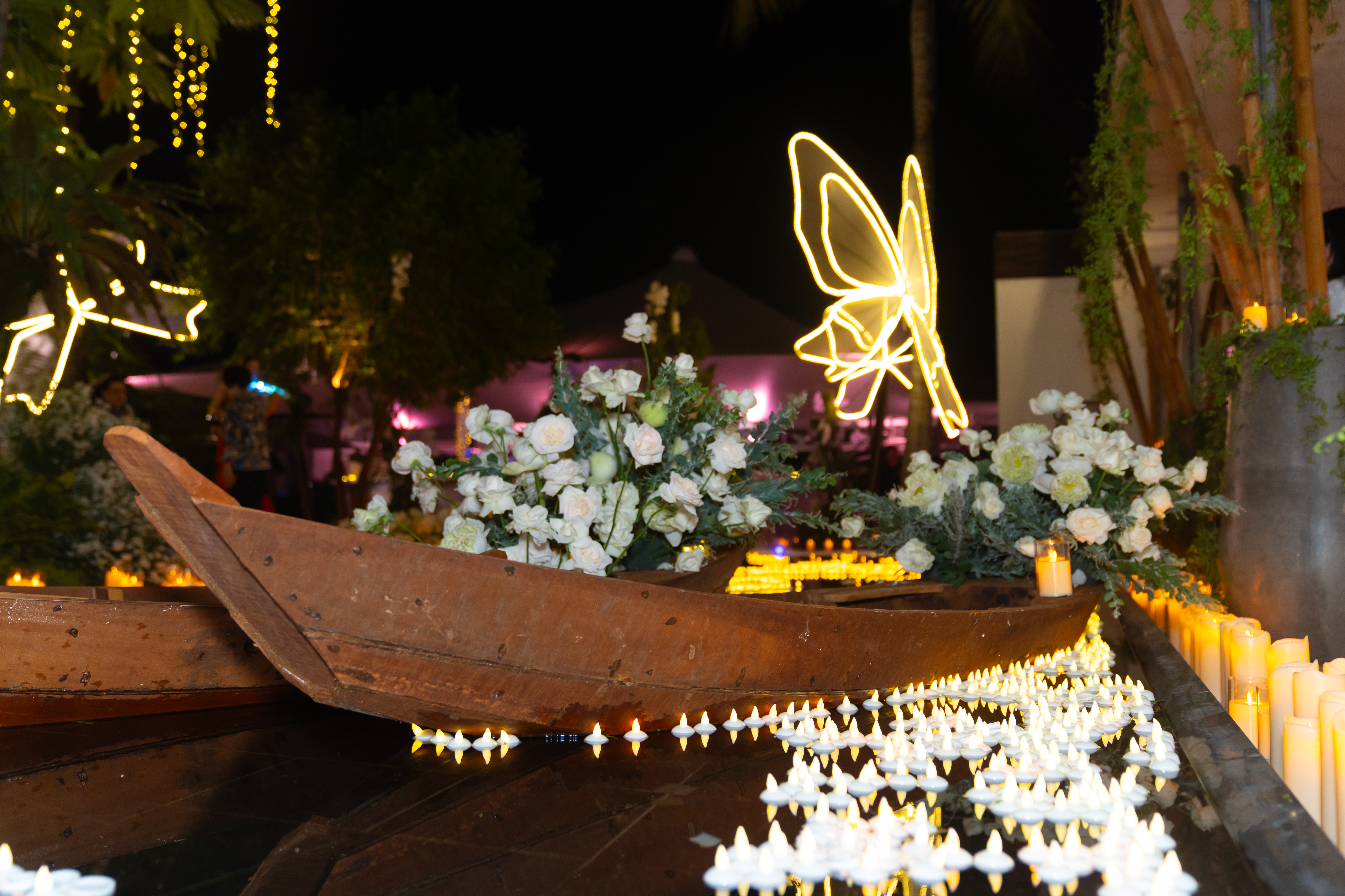 As guests arrived, butterflies, cascading florals, candlelight, and flowing water slowly came together, guiding them through a fairytale-like journey across the venue—demonstrating how thoughtful event management in Vietnam adapts mood and pacing across different environments.