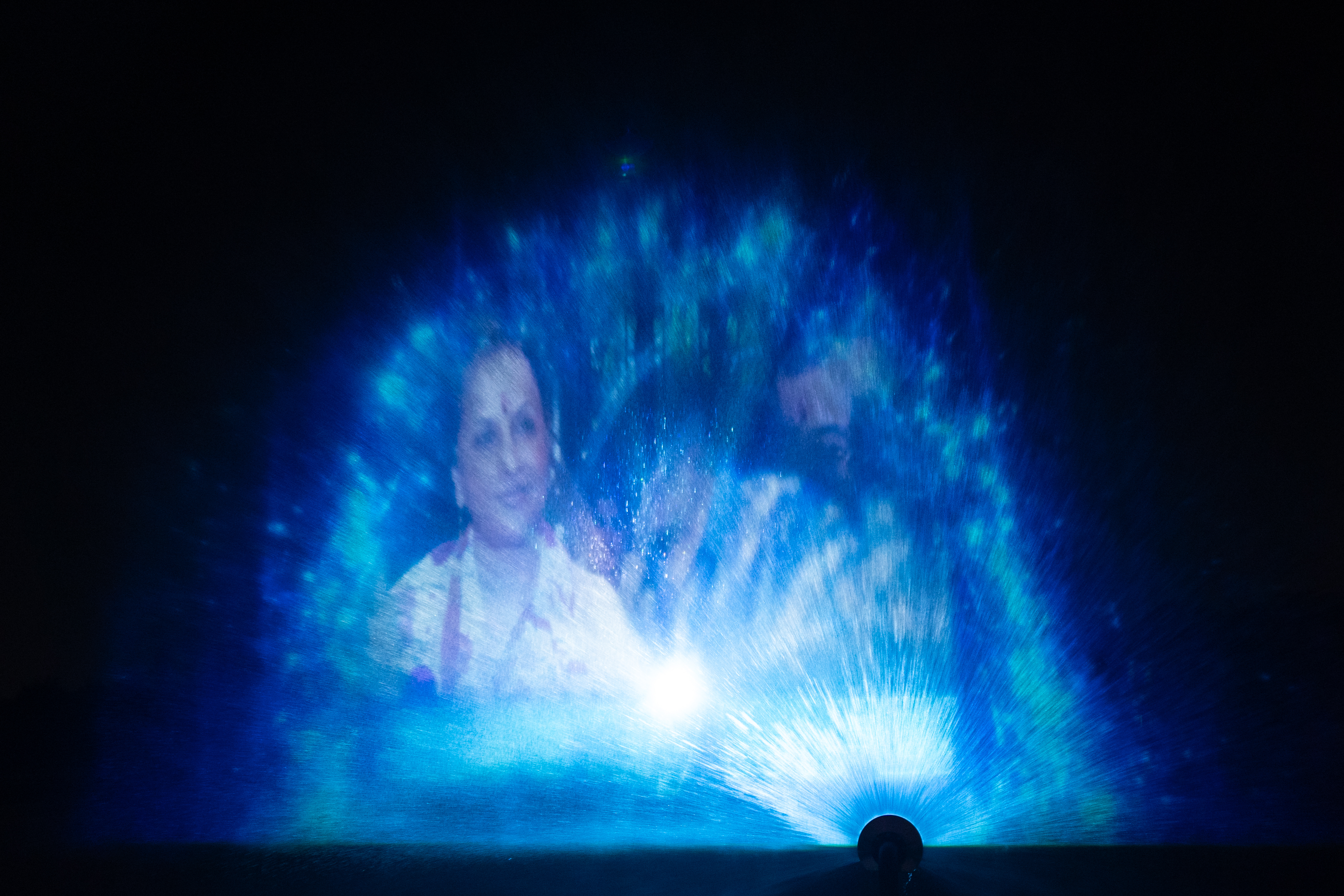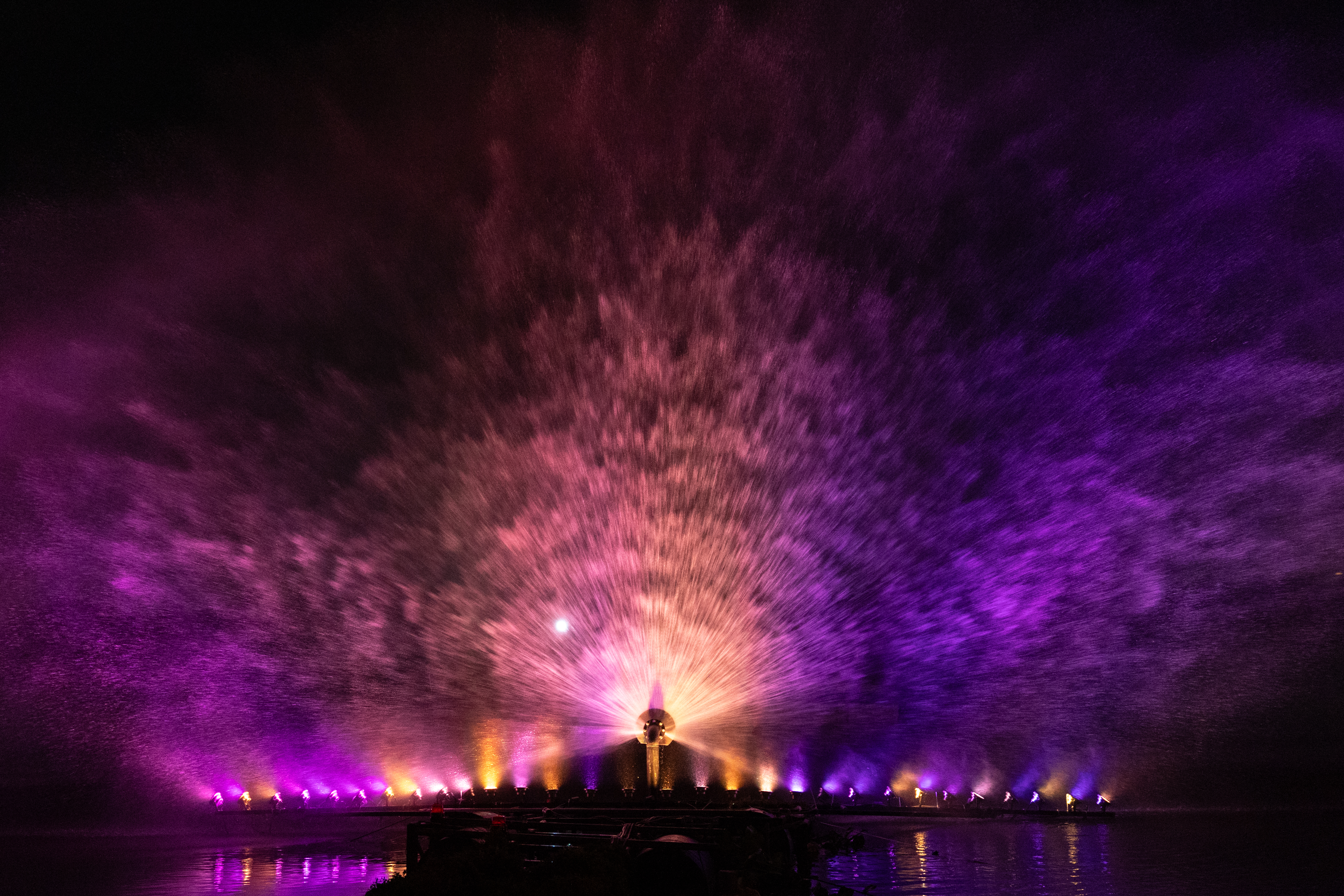 Behind it, a projector mounted on a boat cast storytelling visuals onto the moving mist, creating a cinematic experience visible across the entire venue.