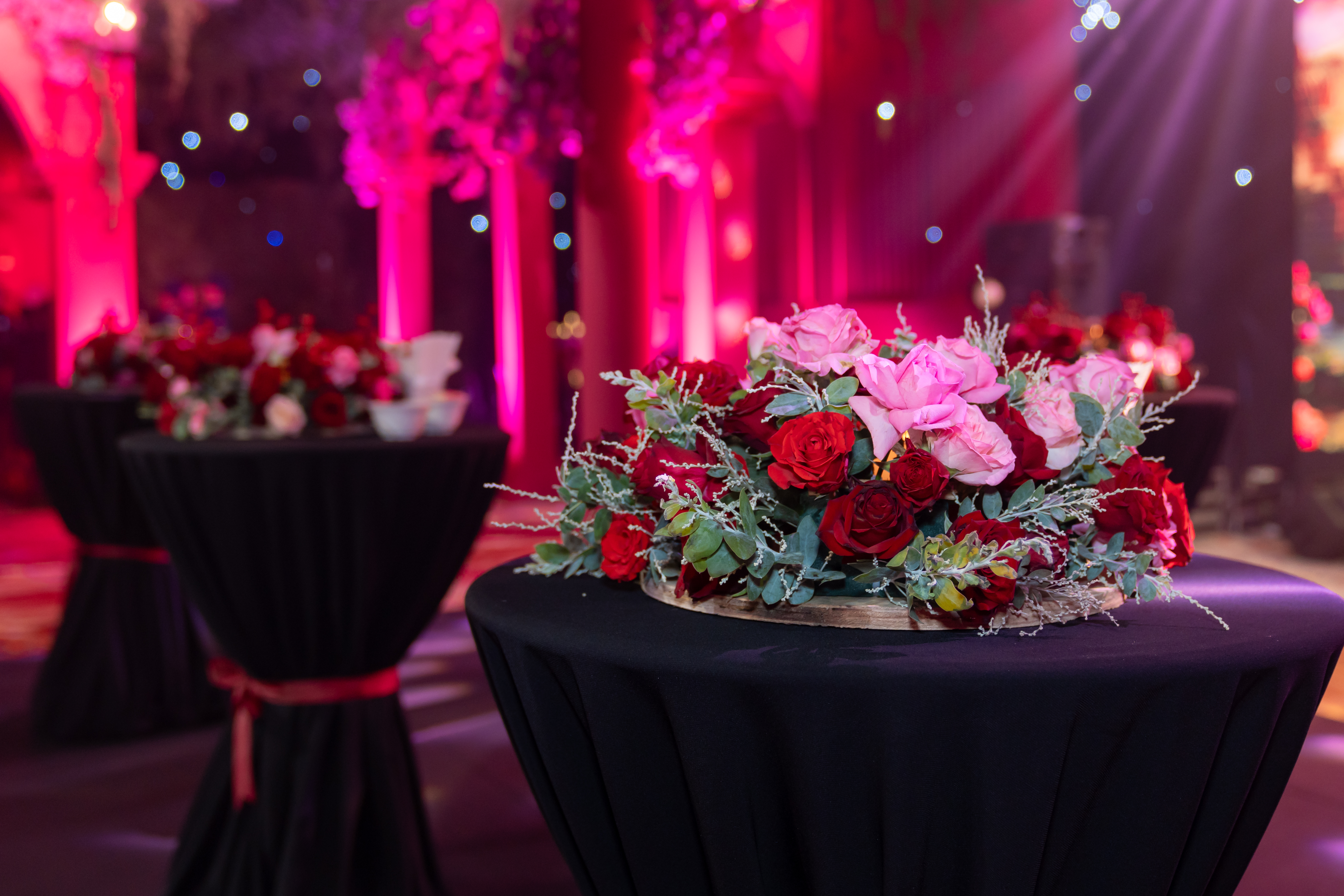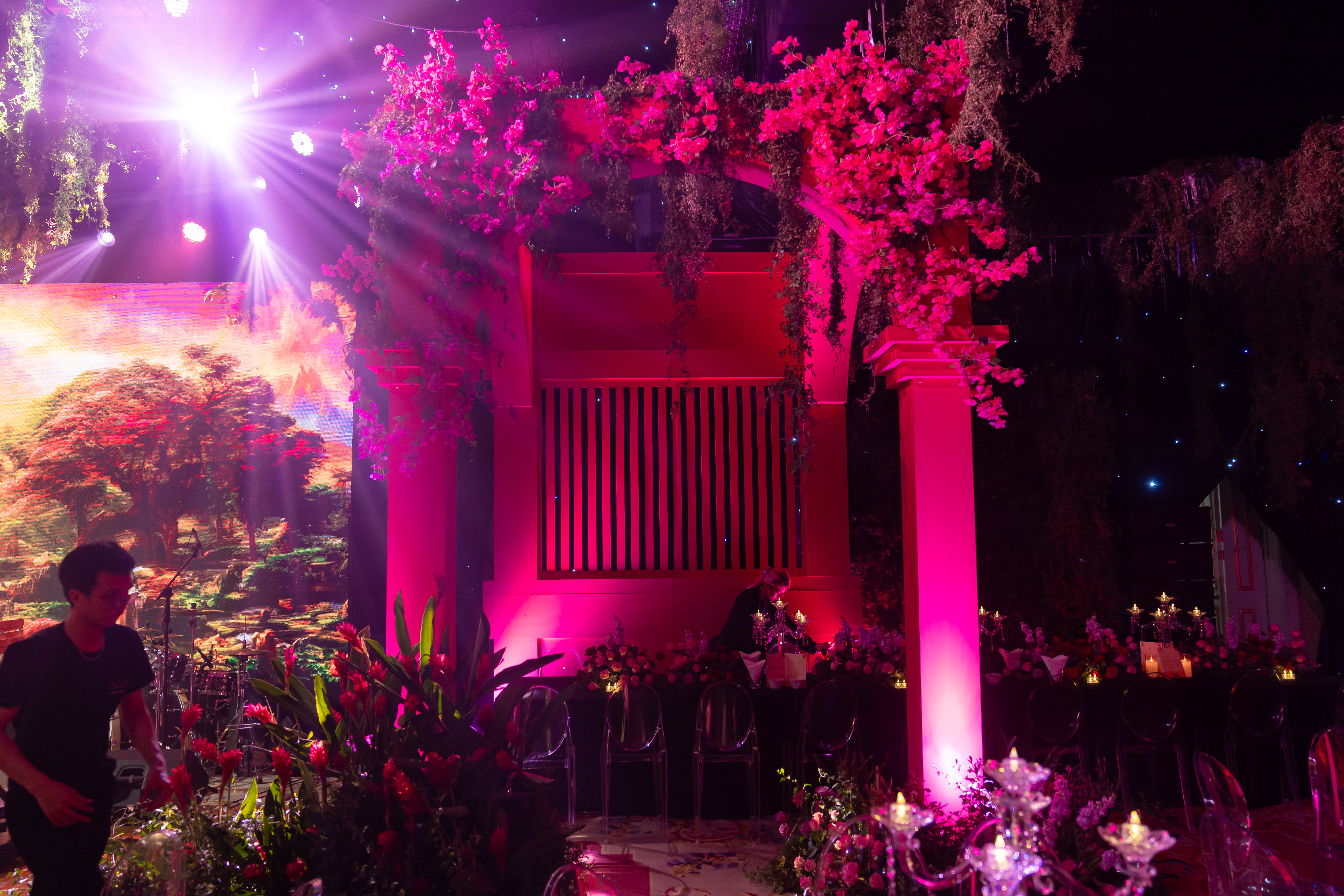 Meanwhile, deep red velvet walls absorbed sound and softened the ballroom into a more intimate, immersive setting.
